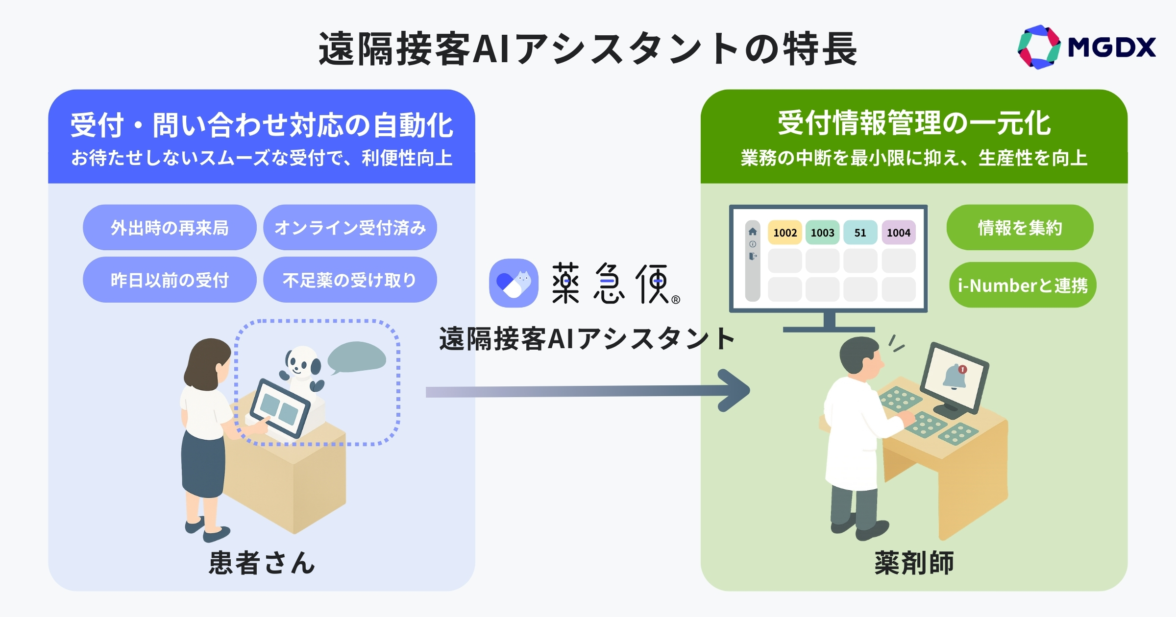 本サービスは、AIと遠隔接客を組み合わせることで、薬剤師の接客業務を支援し、業務の省力化とスムーズな患者さん対応を実現する薬局特化型の接客AIエージェントです。