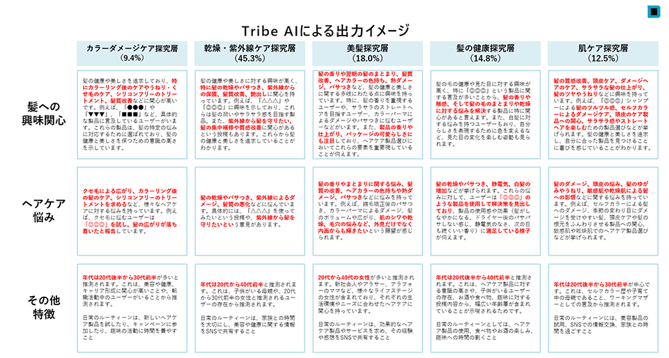 例えば、ヘアケア商材のターゲット分析のために本AIを活用すると、SNSの声から僅かな時間で5つのトライブに分類し、詳細を分析が出力されました(画像)。