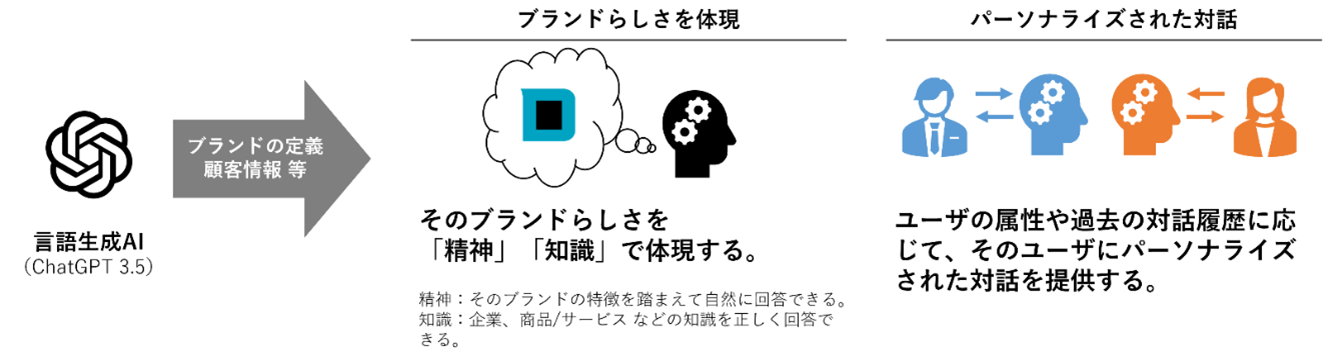 「BrandDialogueAI」は、ChatGPTにブランド人格を付与し、各企業が保有する顧客データや商品データ等を基にしたダイナミックプロンプト※技術を通じて、各顧客とOne to Oneの対話を実施することができるAIチャットボットです。